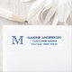 The design features a personalized monogram initial, name and address details in a simple and modern typographic font.