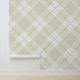 This peel and stick wallpaper features a modern take on the classic gingham style picnic plaid pattern in pale light green and mauve pink.