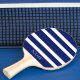 This custom ping pong paddle has a modern classic style with navy blue and white stripe patterns and custom white name text on navy blue stripe banner. Customize the name text to make it personal.