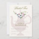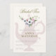 An elegant tea pot, hand drawn, as well as a watercolor floral wreath with anemones and other greenery, decorate this elegant floral themed bridal tea party invitation that also features modern calligraphy. Luxurious but simple, classic but chic, modern but timeless.