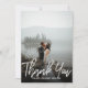 Modern and elegant wedding thank you vertical photo card featuring a white brushed handwritten script on the front "thank you" and a geometric black and white striped pattern on the back.