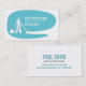 A modern and clean business card with a memorable asymmetric design and a white and blue iconic  and stylized illustration in silhouette representing a cleaning professional. Print on both sides. On the back of the card a play with typography in  crispy blue colour and grey. The blue in the palette is a bright light blue commonly associated with cleanliness and water in design branding.