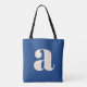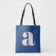 A bold and contemporary tote bag featuring a deep blue background with a striking white lowercase letter in modern typography. Perfect for everyday use, shopping, work, or as a statement accessory, this eye-catching design blends minimalism with a retro-inspired aesthetic. Ideal for typography lovers and those who appreciate stylish, unique designs.