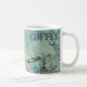 Sketched art of a steaming coffee cup next to a coffee grinder on abstract blue background.