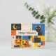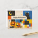 A bold, graphic Halloween illustration inspired by Bauhaus and mid-century modern design. The composition features playful jack-o’-lanterns and a stylized black cat arranged within a grid of geometric blocks in pumpkin orange, mustard yellow, teal, cobalt blue, black, and cream. Simple celestial symbols—a crescent moon and stars—add whimsy, while the clean “Happy Halloween” typography anchors the design.