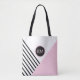 A contemporary pop art geometric pattern with a retro feel, this fashion forward tote bag has angled black stripes and pink colour block with a prominent matching round frame surrounding your monogram. Personalize with your desired monogram for a custom tote that makes a wonderful gift or treat for yourself.
