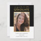 Celebrate the graduate with this contemporary style graduation announcement that also serves as a party invitation. The front of the invitation features a black and white colour block background with a thin golden frame surrounding your vertical portrait. A text template in crisp modern type face is ready to personalize with the graduate's name, class year and school. Load your desired photo in place of the sample photo shown in this card. The back of the card has a party invitation text template to personalize with your event details. This versatile gender neutral design works well for any graduate from high school, college or university,