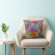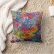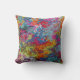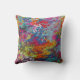 A bold, colourful throw pillow with a unique abstract paint effect in bright pinks, orange, yellow, red, teal and blue which is on both sides of the pillow. A striking addition to any home decor.