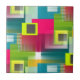 A cool modern artsy abstract pattern made of many geometric shapes and colours layered to create an optical effect. The shapes are squares, rectangles and lines and the colours are shades of blue, green, yellow, pink, white and grey.