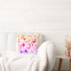 This modern pillow features colourful seamless geometric pattern with lines and shapes in yellow, red, pink, purple, and blue gradient on white background.