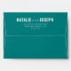 A retro modern hand written bright colourful wedding envelope. Which features bold bride and groom's names in cream colour on teal background. And personalized return address. Which suits the whole wedding suite.