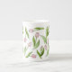 The product design features a pattern of pink tulip flowers. This botanical illustration with personalized text makes a modern and unique bone china mug.