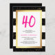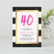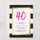 These glam, modern 40th birthday party invitations feature trendy black and white stripes with faux gold confetti and a matching frame, and bright pink typography at the top with her age.