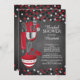 Modern stock the kitchen bridal shower invitation featuring a rolling pin, mixing bowl, spatula, pizza cutter, whisk, vegetable peeler and measuring spoons set on a contemporary chalkboard background with red & black polka dot confetti. Visit our shop to view this invitation in a variety of popular wedding shower invitations.