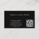 Customize this unique modern business card template with your name, business name and contact details. This stylish black and blue business card with clear simple white script can be edited for your purposes. Add your logo, name and title or business on the front. On the back is a place for more custom text and your QR code. You could add a tagline or services offered or opening hours. Be sure to personalize the back with the company address, telephone number, email or website address. I created this unique design with a turquoise blue light burst on a black background. The blue gradient looks cool and trendy. It would be a great business card template for an engineer, electrician, energy or solar consultant, computer technology business, tech sales, IT business or web designer, security service, property manager, or pastor.