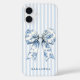 Modern Coquette Blue Stripes Girly Bow Custom Name iPhone 16 Case features a delicate blue floral bow in toile de Jouy style, set against soft blue and white vertical stripes. The clean modern font adds a personalized touch for a girly yet elegant look. Perfect for coquette style lovers or anyone who adores chic, feminine design with a hint of vintage flair.