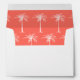 Customize this elegant design featuring modern script typography with your name and return address on the back flap. An artistic coral palm tree adorns the front while the inside of the envelope features a white palm tree pattern over a coral background. If you need help or matching items, please contact me.