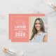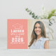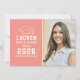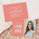 Celebrate your senior with a modern coral graduation party invitation featuring a clean cap icon, bold varsity-style name, and Class of 2026 layout paired with a large photo. Personalize the name, school, year, party details, and RSVP. Backside includes the “Lets Celebrate the Graduate” headline with coordinating open house details.