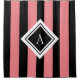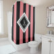 Modern Coral Pink Black Vertical Stripes Monogram Shower Curtain can add a classy touch to a bathroom. Black background with bold black vertical stripes and diamond monogram centred on shower curtain. CLICK PERSONALIZE TEMPLATE OPTION AND ENTER YOUR MONOGRAM INITIAL