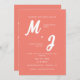 Modern Coral Pink Monogram All-in-One Wedding Invitation. Customize with bride and groom initials, and first and last names with this monogram style wedding invite on the front, and add all of your future wedding details info, such as reception and accommodations details, on the back of the card. You can also change colours and text placement by clicking on "personalize this template," then "edit using design tool." Please message the designer if you need any help making changes.