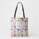 Brighten your day with this cheerful floral tote bag featuring a lively pattern of pink, purple, and yellow flowers, and lush green leaves. The front showcases an inspiring message—“Create Joyful Moments”—framed in a stylish rectangular label, while the back continues the vibrant botanical design for a seamless look.