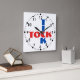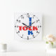 Here's a cool red and blue pattern clock design for any home or office wall. This lightweight acrylic wall clock face has a contemporary designed blue word "Tick" and the red word "Tock" in a crossword puzzle style typography over a white background. The design includes an outer ring of black elements and an inner ring of black numbers.