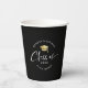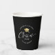 CONGRATULATIONS! Modern custom name graduation paper cups with trendy script calligraphy reading CLASS of under a printed gold grad cap. Personalize with your name in an arch and the year of your graduation.