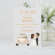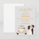 This elegant save-the-date wedding invitation features a timeless design centered around a beautifully illustrated antique wedding car, evoking a sense of vintage romance and charm. Beside it, a bride and groom share a tender kiss, capturing the joy and intimacy of the special moment. The text is presented in a rich marigold hue, adding warmth and sophistication while standing out gracefully against the background. Thoughtfully designed to be fully customisable, every detail—from names and dates—can be tailored to reflect your unique celebration.