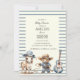 Yeehaw! Saddle up for a rootin' tootin' good time with these adorable cowboy-themed baby shower invitations! Featuring a charming watercolor illustration of a teddy bear dressed as a cowboy and a sweet pony, this design is perfect for celebrating a 'First Rodeo.' The soft blue and cream color palette with subtle stripes adds a touch of rustic elegance, making it a memorable way to invite guests to honor the mom-to-be. This invitation sets the perfect tone for a fun-filled baby shower, ensuring your guests are ready for a Western adventure!