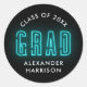 Modern graduation stickers featuring "Grad" in cyan neon lettering with a black background. Personalize the neon graduation stickers by adding the graduate's name and graduation year. The personalized graduation stickers are perfect to seal graduation envelopes and favor bags! Designed to coordinate with our Modern Neon Graduation Collection.