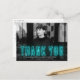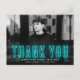 Modern graduation thank you postcard displaying the graduate's horizontal photo with "Thank You" in cyan neon lettering. Personalize the photo graduation thank you postcard by adding the graduate's name, school name, and graduation year. The graduation photo thank you postcard reverses to display your return address and typed thank you message (leave blank to handwrite your own).