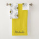 Botanical yellow and white bath towel set, with a modern daisies and script typography design. With grey customizable lettering, you can add your own name. Great for adding a boho touch to your bathroom decor.
