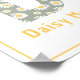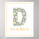 Cute print for nursery or kid's room features monogram letter D in a fun white daisies on grey background print with customizable sunny yellow text and a thin border frame.