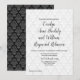 Stylish modern wedding invitation done in a white on white damask pattern, on the front and a black on black damask pattern, on the backside. A combination of script calligraphy and regular fonts make for a unique stylish look. Personalize all the custom text fields for your wedding. Matching products are available.