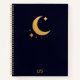 A modern, minimalist notebook with a dark navy blue background and gold foil effect crescent moon and stars. At the bottom, in modern gold typography, you can personalize with a monogram. The back of the notebook is a plain dark blue to match the front. If you don't want to personalize with your details, simply delete the example text in the Personalize option box.