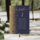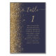 The left-hand edge of this elegant modern wedding table number card features a gold faux glitter border. The word "table" appears in gold-coloured whimsical handwriting script on a dark blue background. Add the names of your guests who are assigned to each table.