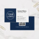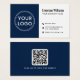 Modern, white and dark blue business cards with custom logo template and QR cude on the back. Modern, minimal design. Fonts, font colours and background colours can be changed with the customization tool.