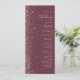 The left-hand edge of this elegant modern wedding program features a rose gold faux glitter design. The customizable text combines rose pink handwriting, copperplate and italic fonts on a dark burgundy background.