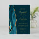 The left-hand edge of this elegant modern wedding invitation features a teal blue watercolor agate border trimmed with faux gold glitter. The customizable text combines handwriting, copperplate and italic fonts in real gold foil on a dark teal background. The reverse side features a matching teal and gold agate design.
