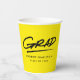 Modern graduation paper cups featuring "Grad" displayed in black, handwritten lettering with a dashed underline on a yellow background (or colour of your choice). Personalize the yellow graduation paper cups by adding the graduate's name and graduation year. The design repeats on the back. The personalized graduation paper cups are perfect for both high school and college graduation parties!