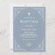 These elegant Baptism invitations feature a modern spin on classic art deco. An ornate, white geometric frame and cross decorate a lovely dusty blue background for a stylish, vintage look.
