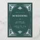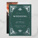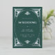 These glamourous silver foil wedding invitations feature a modern spin on classic art deco. An ornate, silver geometric frame and ornamentation decorate an elegant rich festive green background for a dramatic, glamourous and vintage 1920's wedding look that is perfect for your Christmas holiday wedding. Add your photo to the back.