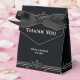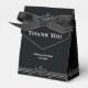 These glamourous wedding favour boxes feature a modern spin on classic art deco. An ornate, white geometric frame and ornamentation decorate an elegant dark onyx black background for a dramatic, vintage wedding look. The front flap of the box says "thank you."
