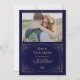 These glamourous wedding save the date cards feature a modern spin on classic art deco. An ornate, faux rose gold look geometric frame and ornamentation decorate an elegant dark navy blue background with your favourite personal photo for a dramatic, vintage wedding look.