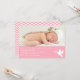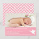 A modern, stylish and minimalist Christening or Baptism sweet pink invitation in honour of the baby girl. The design comes with a flying dove carrying leaves in its beak. A sweet pink colour palette to contrast with the white text. Personalise with photo of the little one. On the reverse page is a pink and white chevron zigzag pattern. Sample photo provided by TawnyNina.