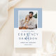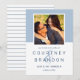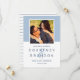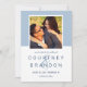 A crisp and contemporary two-sided save the date featuring a soft dusty blue colour block framing a square engagement photo, with bold navy names and clean typography on a white lower panel. The coordinating navy striped back adds a refined nautical touch. The blue-on-white palette creates a fresh, timeless look suited to coastal, garden, or classic wedding aesthetics. All text and photo are fully customizable.