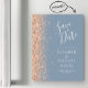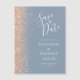 The left-hand edge of this elegant modern wedding save the date magnetic card features a peach faux glitter border. The customizable text combines white handwriting, copperplate and italic fonts on a dusty blue background.