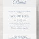 Modern dusty blue typography and small flowers on white background all in one wedding invitation. It displays your names in a cursive script elegant style typography and two small blue flowers with leaves on both sides of the ampersand on white. The RSVP can be detached.