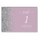 The left-hand edge of this elegant modern wedding table number features a silver faux glitter design. The customizable text combines white handwriting, copperplate and italic fonts on a dusty lavender purple background.