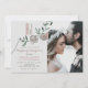 This modern floral photo wedding invitation features a clean split layout with a large personal photo on the right and elegant rose illustrations paired with the couple’s initials on the left. Accented in dusty rose and greenery, it’s both fresh and romantic—ideal for couples who want to make a meaningful first impression with simplicity and warmth.